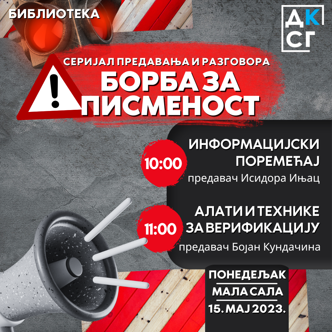 Исидора Ињац и Бојан Кундачина су запослени у Библиотеци града Београда и предавачи су на акредитованом курсу Новинска писменост и критичко мишљење.