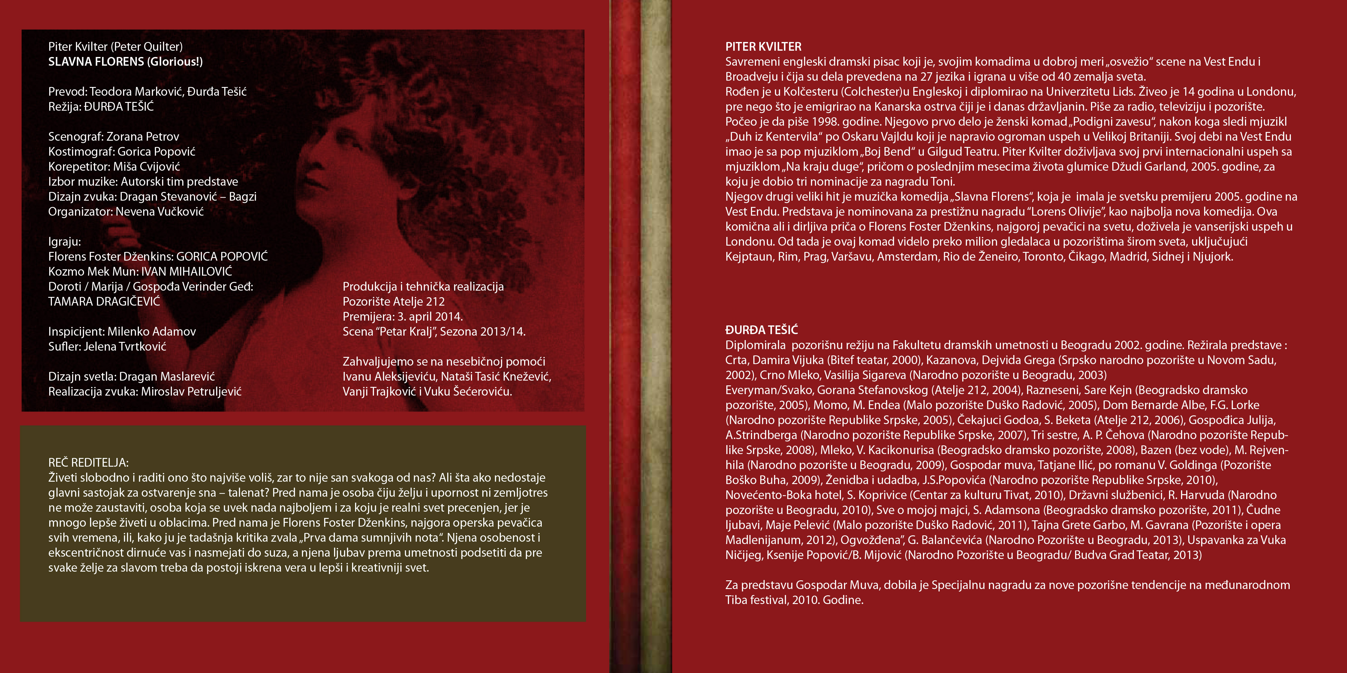 СЛАВНА ФЛОРЕНС, по тексту британског драмског писца Питера Квилтера, jе истинита прича о Флоренс Фостер Џенкинс, најгорој певачици на свету, која је четрдесетих година у Њујорку била омиљена музичка атракција. Флоренс Џенкинс се прославила оперском каријером, иако није умела да пева. Комад прати њен живот у време када њена каријера достиже врхунац – наступом у Карнеги холу!
