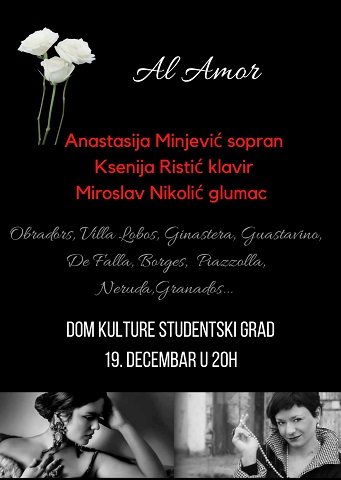 Koncertni projekat „Al Amor" nastao je po ideji i u izvođenju Anastasije Minjević (sopran) i Ksenije Ristić (klavir), uz kreativnu podršku glumca Miroslava Nikolića. Publika će biti u prilici da čuje kompozicije latinoameričkih i španskih kompozitora koje su nedovoljno poznate širem auditorijumu. U pitanju su dela Alberta Ginastere, Karlosa Guastavina, Vila Lobosa, de Falje, Obradorsa, Granadosa i Pjacole. Kompozicije su poetski ilustrovane poezijom Nerude i Borhesa.