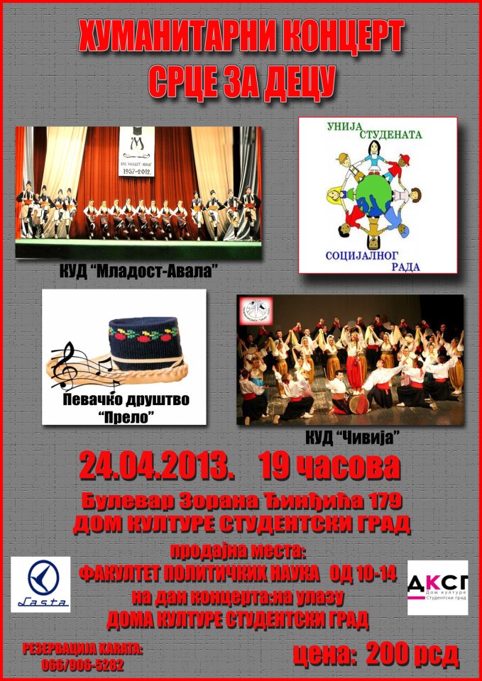 ******* HUMANITARNI KONCERT ******* „SRCE ZA DECU“ U sredu, 24. aprila u Domu kulture „Studentski grad“, na Bulevaru Zorana Đinđića 179, sa početkom u 19 časova, održaće se HUMANITARNI KONCERT…